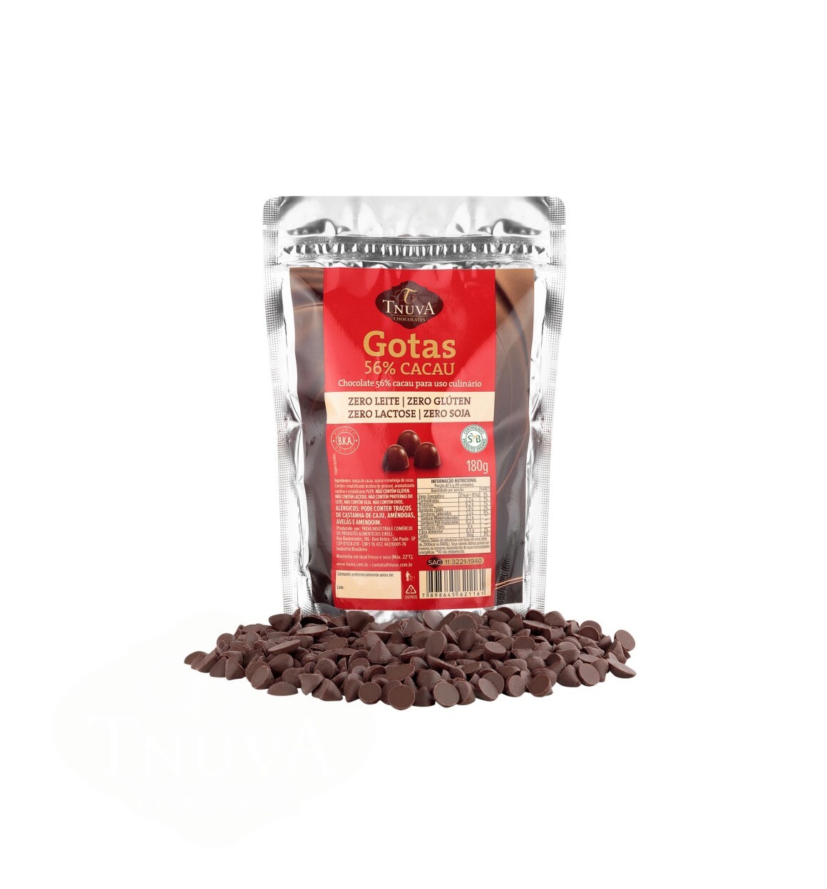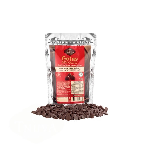 Embalagem com 180g de Chocolate 56% Cacau em formato de gotas para uso culinário - Zero leite, Zero Glúten, Zero Soja, 100% Vegano- Zero Leite, Zero Glúten, Zero Soja, 100% Vegano